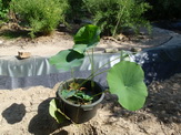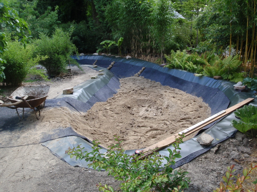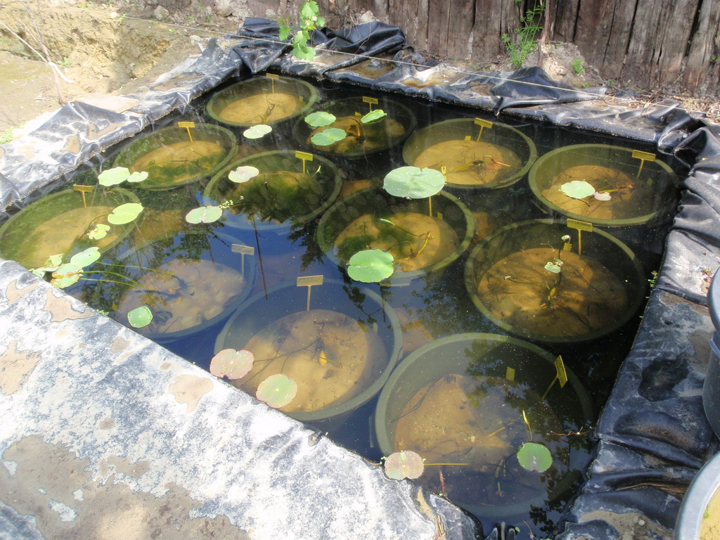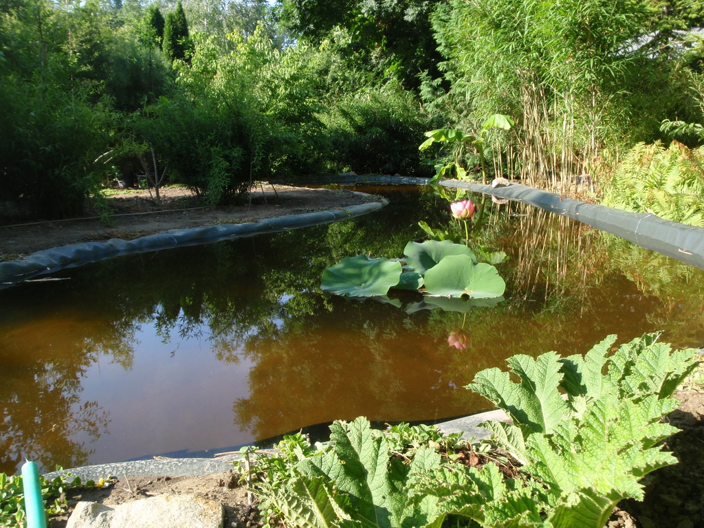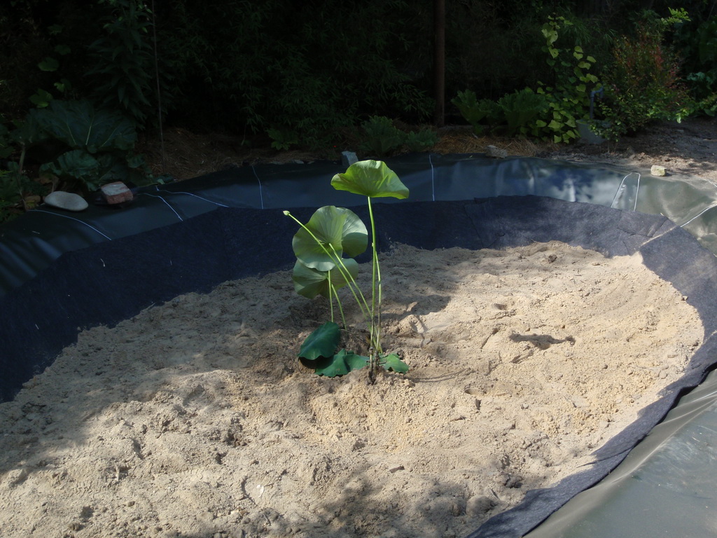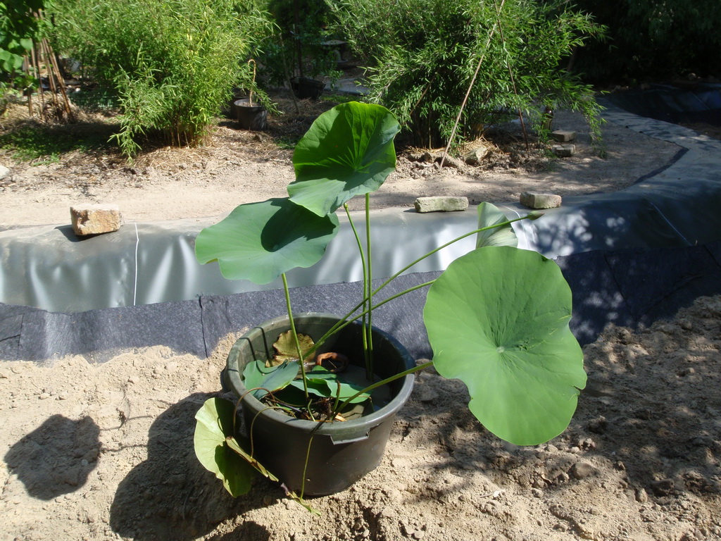 - Pri tomto spôsobe potrebujeme podstatne viac miesta, ako pri pestovaní v nádobe. Efekt je ale pôsobivejší, nakoľko na väčšej ploche sa rastlina lotosu lepšie vyvíja a je schopná dať aj mnohonásobne viac kvetov. Pri tomto spôsobe odporúčam minimálne 5 – 10 m2. Čím viac, tým lepšie. Môžeme si zvoliť lotosové jazierko len ako sólo porast, alebo porast lotosov ako súčasť väčšieho komplexu vodnej plochy a rastlín. Nakoľko sa lotos pomerne rýchlo rozširuje do okolia, je nutné vyhradiť mu samostatnú časť tak, aby priestor s lotosom bol oddelený od ostatnej výsadby tak, aby predel bol tesne pod hladinou (cca 10 cm ) a tým bolo zabezpečené, aby ostal len na mieste jemu vyhradenom. Ak sa rozhodneme týmto spôsobom pestovať viacero druhov, musíme každej odrode vymedziť samostatný priestor, aby nedošlo k ich premiešaniu. Samotná príprava zakladania je nasledovná: Nakreslíme si obvod jazierka. Priestor na výsadbu lotosu vyhĺbime asi do 80 – 100 cm, pričom jama sa mierne smerom dole zvažuje. Výkop po vyhladení nastelieme pevnou geotextíliou, následne sa umiestni jazierková fólia. Vhodné je, aby bola fólia lepená na mieste, aby neostávali na nej záhyby. Tie môžu spôsobiť, že lotosový koreň ako rastie sa dostane do záhybu a môže sa pri ďalšom raste zlomiť a tým môže prísť k jeho poškodeniu, alebo aj úhynu. Na fóliu dávame ďalšiu vrstvu geotextílie, ktorá chráni fóliu pred poškodením pri navážke substrátu. Piesčito – ílovitý substrát bez prímesi organických častí navážame asi 30 – 40 cm pod budúcu hladinu jazierka.