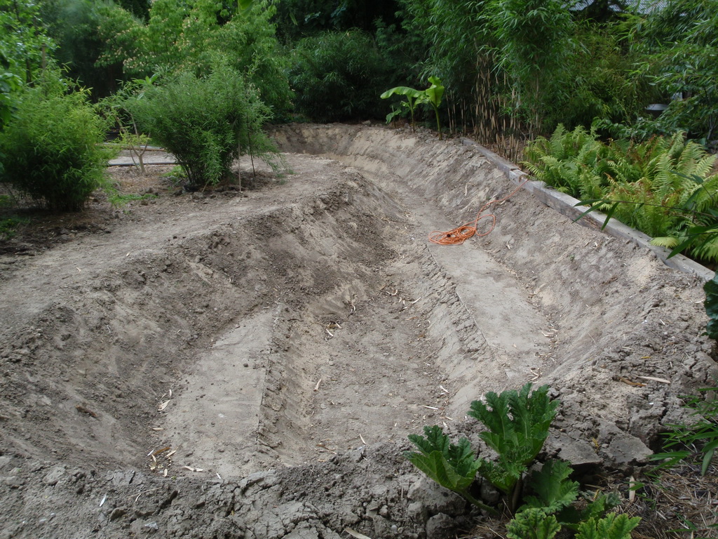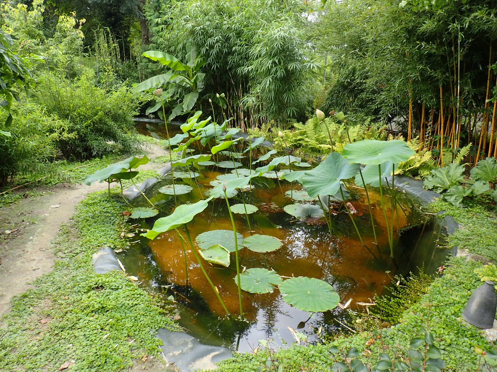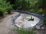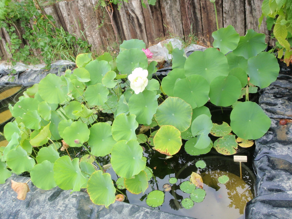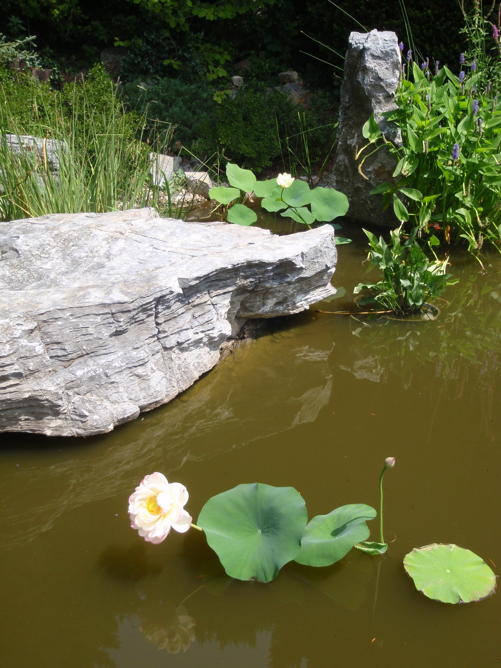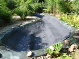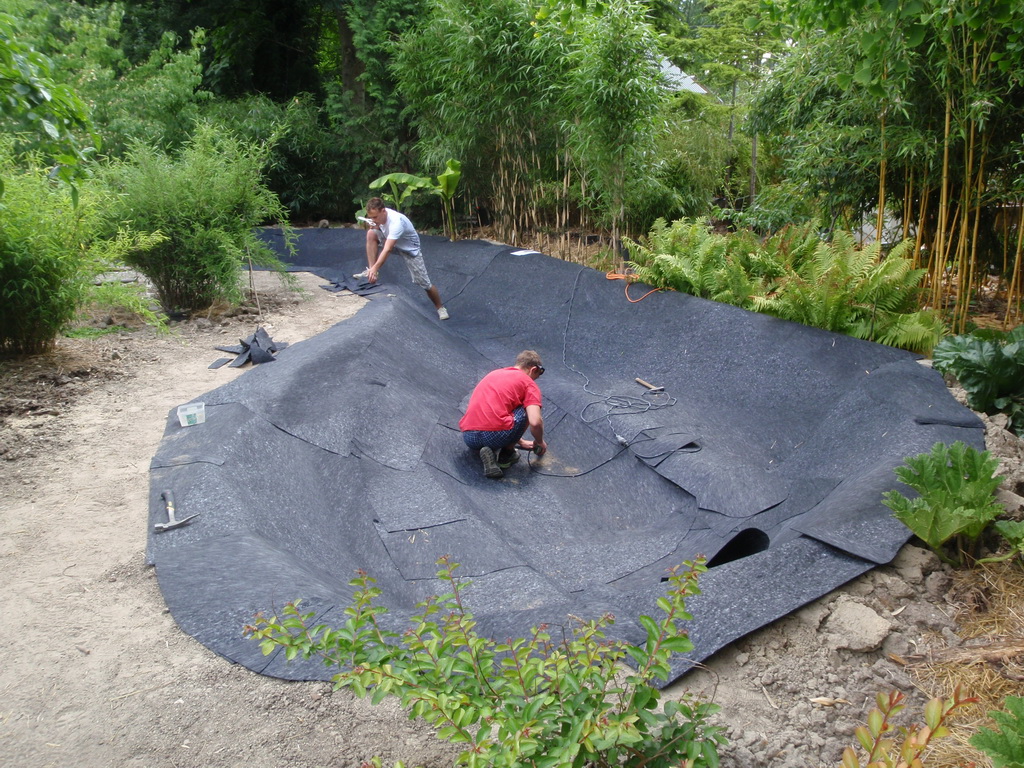 - Pri tomto spôsobe potrebujeme podstatne viac miesta, ako pri pestovaní v nádobe. Efekt je ale pôsobivejší, nakoľko na väčšej ploche sa rastlina lotosu lepšie vyvíja a je schopná dať aj mnohonásobne viac kvetov. Pri tomto spôsobe odporúčam minimálne 5 – 10 m2. Čím viac, tým lepšie. Môžeme si zvoliť lotosové jazierko len ako sólo porast, alebo porast lotosov ako súčasť väčšieho komplexu vodnej plochy a rastlín. Nakoľko sa lotos pomerne rýchlo rozširuje do okolia, je nutné vyhradiť mu samostatnú časť tak, aby priestor s lotosom bol oddelený od ostatnej výsadby tak, aby predel bol tesne pod hladinou (cca 10 cm ) a tým bolo zabezpečené, aby ostal len na mieste jemu vyhradenom. Ak sa rozhodneme týmto spôsobom pestovať viacero druhov, musíme každej odrode vymedziť samostatný priestor, aby nedošlo k ich premiešaniu. Samotná príprava zakladania je nasledovná: Nakreslíme si obvod jazierka. Priestor na výsadbu lotosu vyhĺbime asi do 80 – 100 cm, pričom jama sa mierne smerom dole zvažuje. Výkop po vyhladení nastelieme pevnou geotextíliou, následne sa umiestni jazierková fólia. Vhodné je, aby bola fólia lepená na mieste, aby neostávali na nej záhyby. Tie môžu spôsobiť, že lotosový koreň ako rastie sa dostane do záhybu a môže sa pri ďalšom raste zlomiť a tým môže prísť k jeho poškodeniu, alebo aj úhynu. Na fóliu dávame ďalšiu vrstvu geotextílie, ktorá chráni fóliu pred poškodením pri navážke substrátu. Piesčito – ílovitý substrát bez prímesi organických častí navážame asi 30 – 40 cm pod budúcu hladinu jazierka.